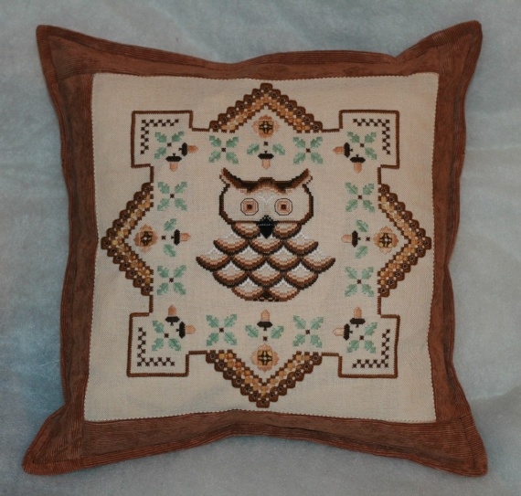 Для вышивки подушки не будет ничего нового — в технике борджелло более темным цветом отшиваем нижние перья, а более светлым — верхние. Оформляем голову совы крестиком дальше по схеме. Снизу лапки тоже вышиваем крестиком.