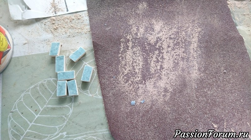 Если присмотреться то видно, что первые зеленые кусочки по краю не обработаны имеют неровные края. Мне это не понравилось и далее каждый кусочек мозаики обрабатывался. Есть специальная насадка на болгарку, которая делает красивую фаску, но в этом году мне ее приобрести не удалось, дефицит в нашем городе. Чем я ограничилась будет ниже.