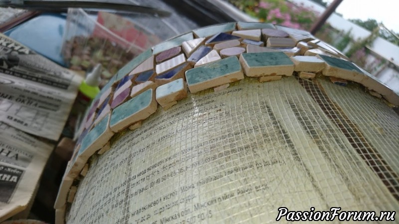 Здесь необходимо показать, что на ведре была выпуклость, которую надо было сгладить. Я это сделала подкладывая под каждую мозаику небольшой кусочек.