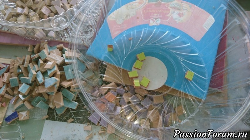 Процесс остальных элементов аналогичный. Только на этом этапе у меня появились кусачки для мозаики, фотографии нет, я приобрела кусачки для камня, поэтому плитку колят чудесно и так как надо.