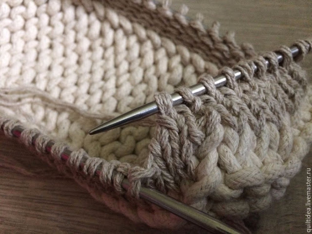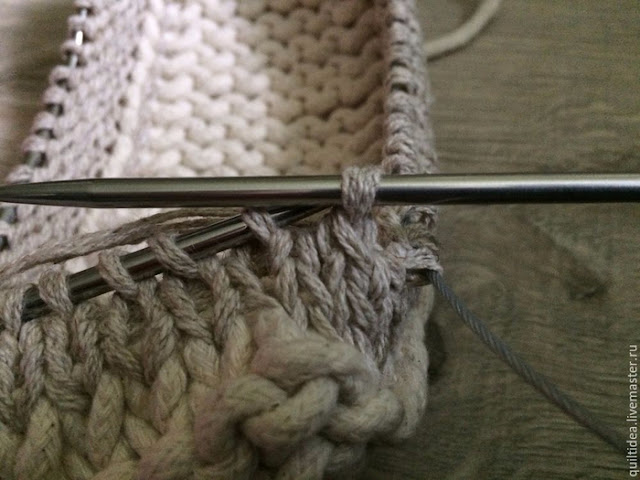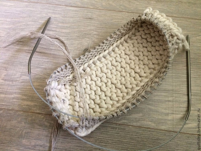 Поворачиваем подошву к себе боковой косичкой. Из верхней стенки косички набираем льняной пряжей петли на круговые спицы.