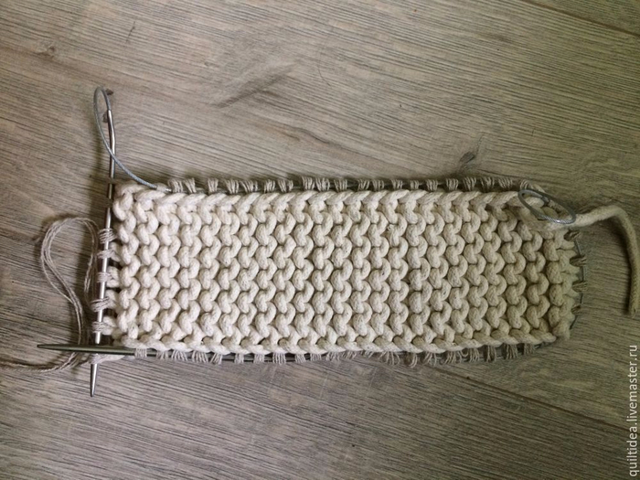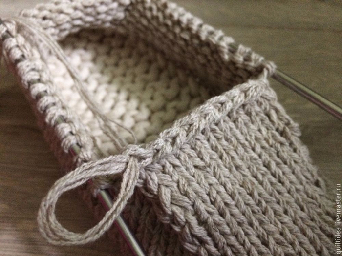 Для этого выделяем петли по одной из коротких частей подошвы (противоположной той, с которой торчит хвостик шнура). Количество петель будет равно набранным для вязания подошвы плюс по одной с каждой стороны. У меня 8+2=10 п. Это количество петель должно остаться неизменным. Если вам сложно следить за их количеством, отметьте их маркерами для вязания. На фото я сняла их на вспомогательную спицу для наглядности. Вязать будем их также на круговых спицах