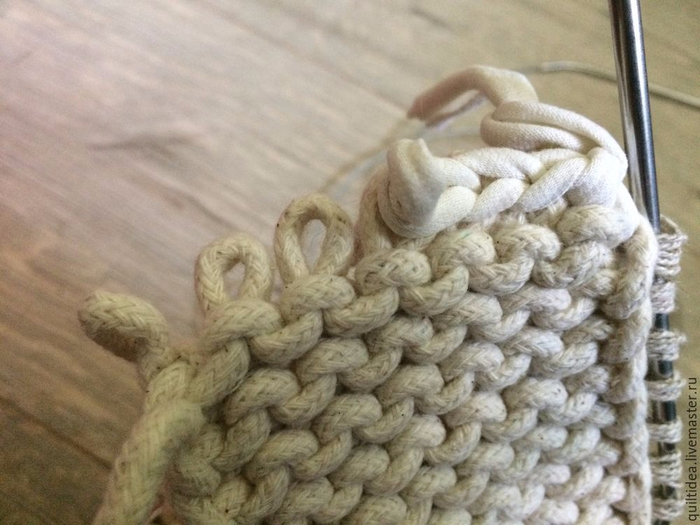 Когда набраны все петли по длинной стороне, распускаем цепочку вспомогательной нити. Для этого найдите конец цепочки, освободите нить и потяните. Придерживайте петли шнура, которые высвобождаются. Поднимите петли на спицу и провяжите их льняной нитью.