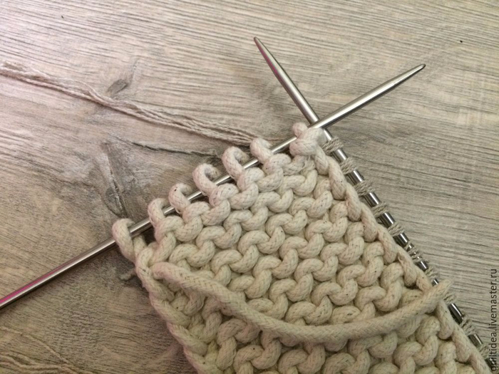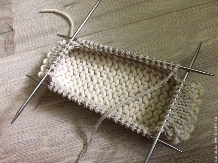 Вяжем по кругу 4 ряда лицевой гладью. Это самая сложная часть работы. Помогайте себе, вытягивая по углам петельки из тросика спиц. Не берите дорогие спицы, так как леска подвергается значительным нагрузкам.