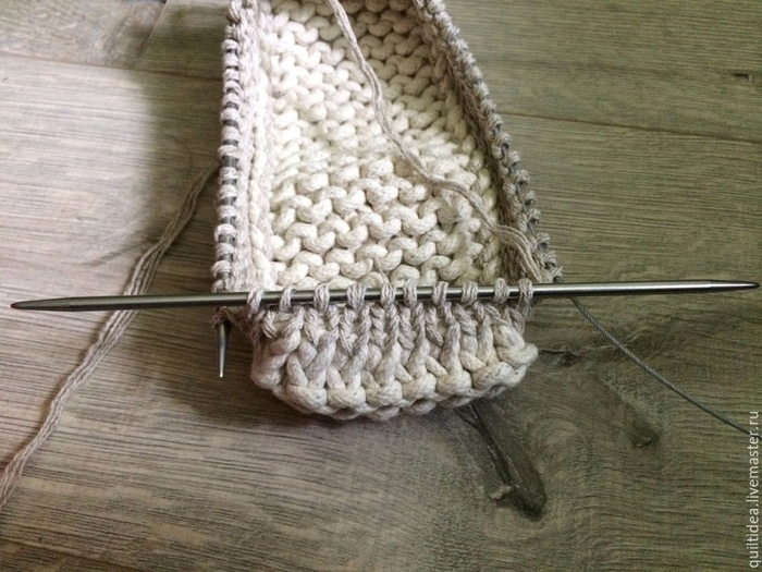 Для этого выделяем петли по одной из коротких частей подошвы (противоположной той, с которой торчит хвостик шнура). Количество петель будет равно набранным для вязания подошвы плюс по одной с каждой стороны. У меня 8+2=10 п. Это количество петель должно остаться неизменным. Если вам сложно следить за их количеством, отметьте их маркерами для вязания. На фото я сняла их на вспомогательную спицу для наглядности. Вязать будем их также на круговых спицах.