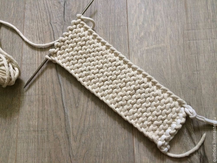 Вяжем прямоугольник платочной вязкой, то есть и в лицевых, и в изнаночных рядах петли провязываем лицевыми. Первую петлю снимаем, рабочая нить перед работой.