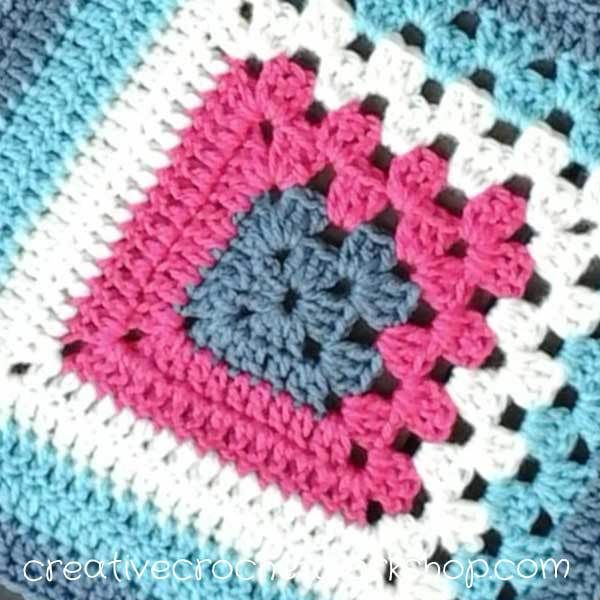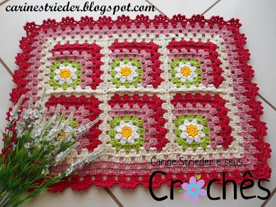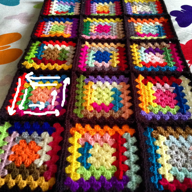 Очень интересна идея наложения цветовых звеньев по принципу лог-кэбин, когда вокруг цветочка в центре(обвязанного ещё одним круговым рядом того же цвета),звено каждого цвета равно длине одной стороны:
