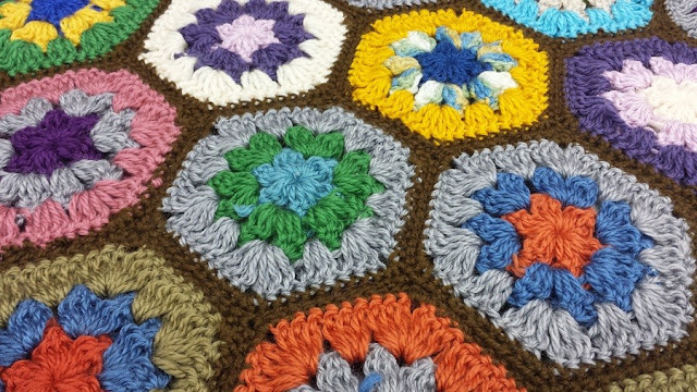 А здесь, в первом круговом ряду каждый лепесток центрального цветочка вяжется разным цветом. В следующем ряду каждым цветом провязывается по 2 лепестка подряg; в третьем ряду каждым цветом вывязывается по 3 лепестка подряд, и так далее.