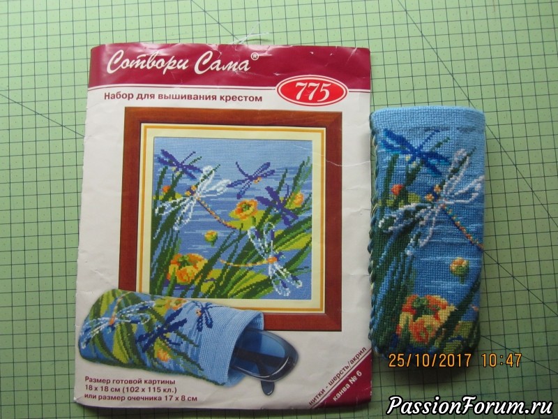 Что-то в долгострой ушла совсем))) Только в начале осени удалось один из них закончить.Показываю результат с трепетом))) Набор и то что получилось. Внутри-подкладка.В наборе предлагалось сделать ее из канвы, но я вставила ткань подкладочную, чтобы очки не цеплялись дужками и винтиками.Еще раз-поближе.Ну и как вам?