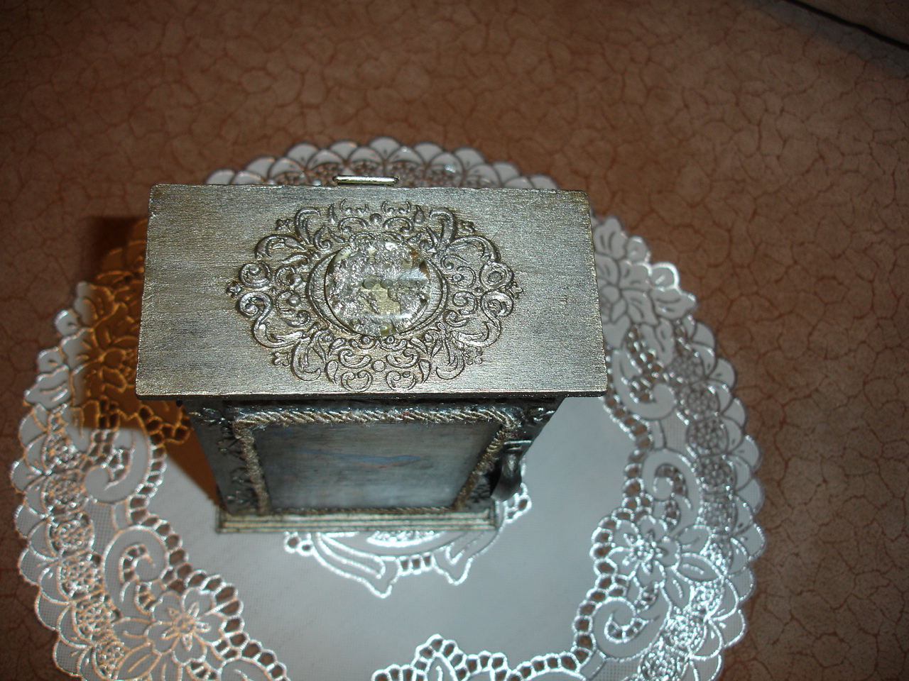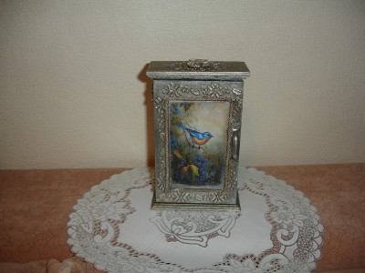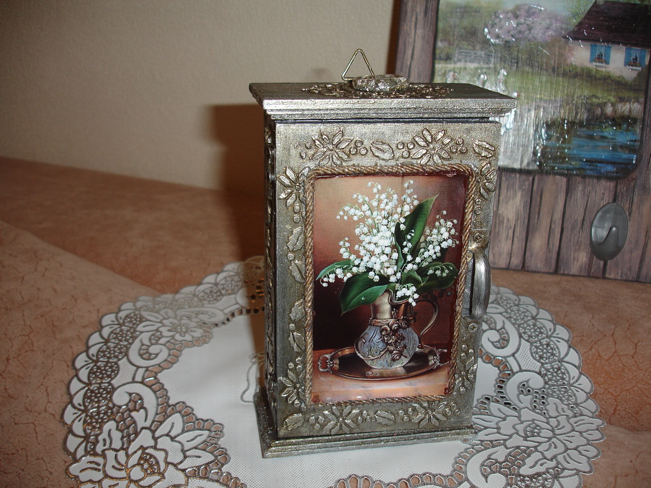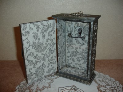 Попалась мне заготовка ключницы.Решила добавить к шкатулкам.Хотела приклеить наверх кабошон,в продаже не встретила,приклеила полупрозрачную серебряную пуговицу.Цвет никак не могла поймать,бликует. Использовала шпаклевку,распечатку,трафарет