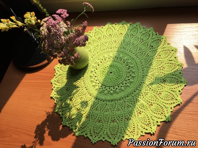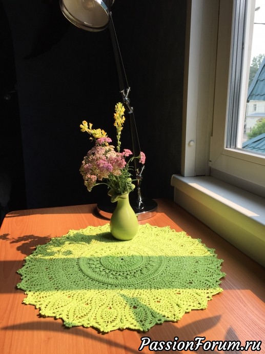 Марина, салфетка действительно первая. Спасибо за отзыв. В задумке на будущее на основе связать небольшой ковёр. Вот только бы день увеличить по времени.