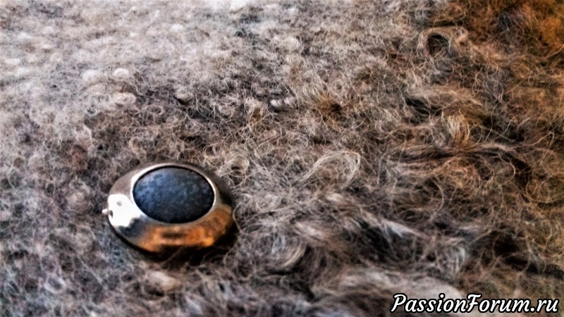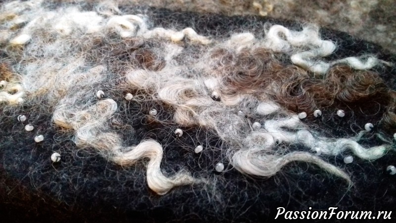 Заказала подруга. Обговорили фасон, флис, фактуру, цвет флиса и шерсти-основы. Сваляла образец. Ещё раз убедилась, что флис смотрится лучше, если шерсть-основа более тёмного цвета. На образце было два вида шерсти - молочная и почти чёрная (графит). Так вот на тёмном фоне фактура выглядит богаче и интереснее.