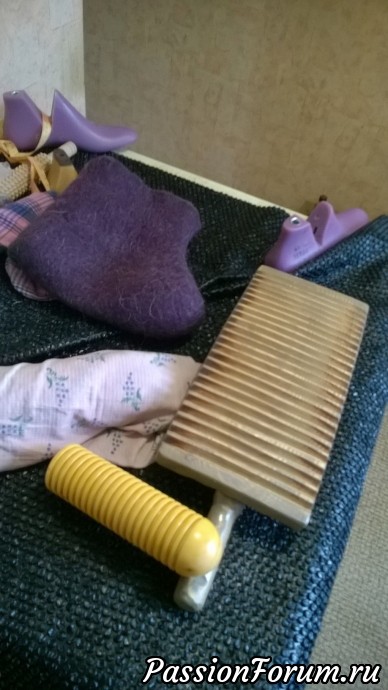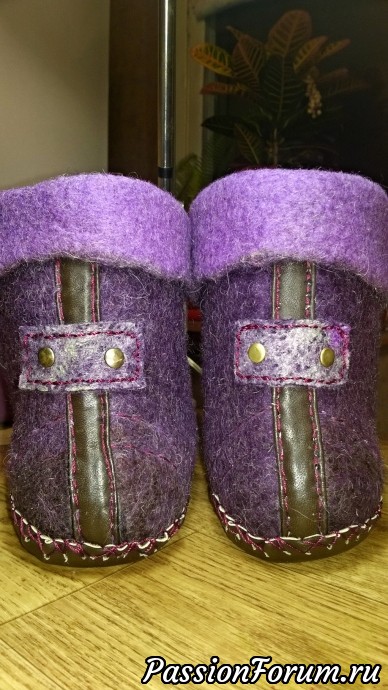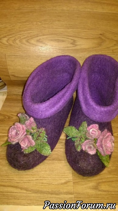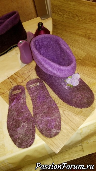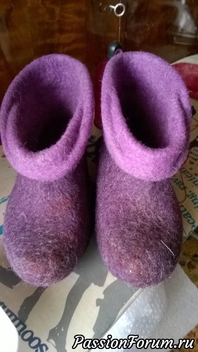 Меня попросили свалять чуни для подарка на день рождение мамы. Заказчица выбрала фиолетовый цвет и сиреневый на внутреннюю сторону.