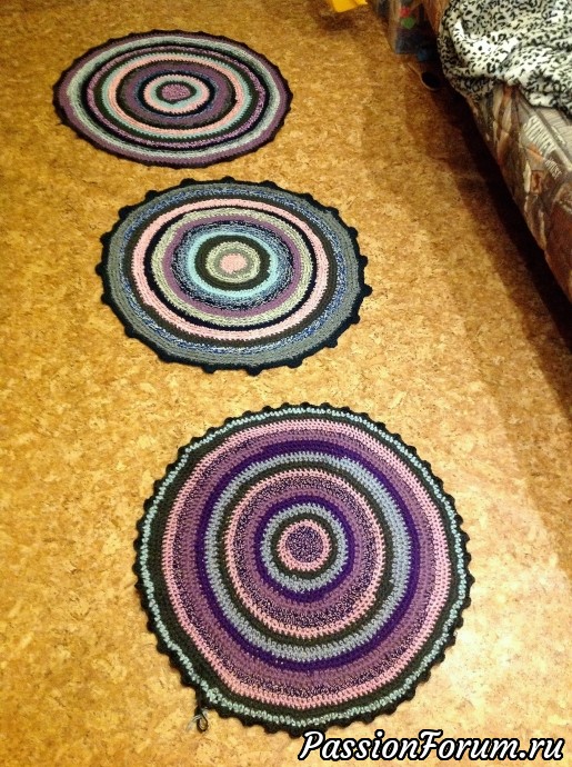 У меня этот коврик тоже из сборных клубочков, многие из моего детства. Бабушка вязала носки из роспуска и остатки ее клубочков долежали до наших дней. Мама сохранила, а я не смогла выбросить. Почти 2 кг увязала в этот коврик. Правда это не окончательный его вариант, сейчас он подлиннее на пару рядочков.
