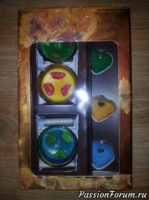 Это набор из свечей и вязанных игрушек в виде сердца. Свечи заливала из цветного воска, игрушки из акрила, коробка из под виски, предварительно окрашенная. Набор делался для благотворительной ярмарки от кожуховского приюта для безнадзорных животных.Я как бы немного волонтер еще. Будет время, выложу все работы для ярмарок от приюта.