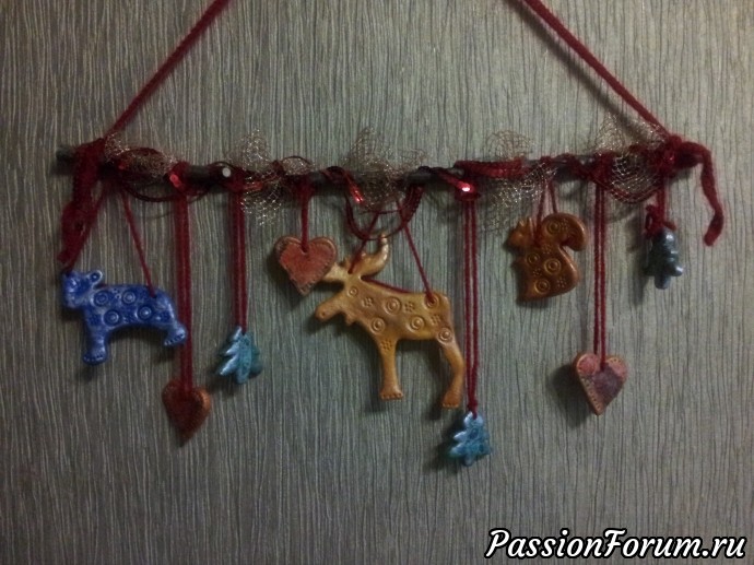 Подвеска на стену. Игрушки из соленого теста, раскрашенные акриловыми красками. Основа - это самая обыкновенная ветка. В том году после ледяного дождя много деревьев повалило, так что ни одна живая ветка не пострадала. Фотограф из меня никакой - фото опять темнее оригинала.
