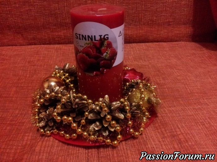 А это поделка для тех, кому срочно нужен подарок, но нет времени. Делается буквально за час. Берем цветную тарелку из фикс прайса, клеим на неё шишки, затем между шишек клеим мишуру нужного вам цвета, шишки можно подкрасить (но если нет времени можно оставить натуральные), потом клеим небольшие елочные игрушки на ваш вкус и фантазию и добавляем немного пластиковых бус в тон нашей поделки. Вуаля - подарок готов. Не забудьте про свечку в центр тарелки. Понимаю ,что велосипед я не изобрела, просто хотелось поделиться.