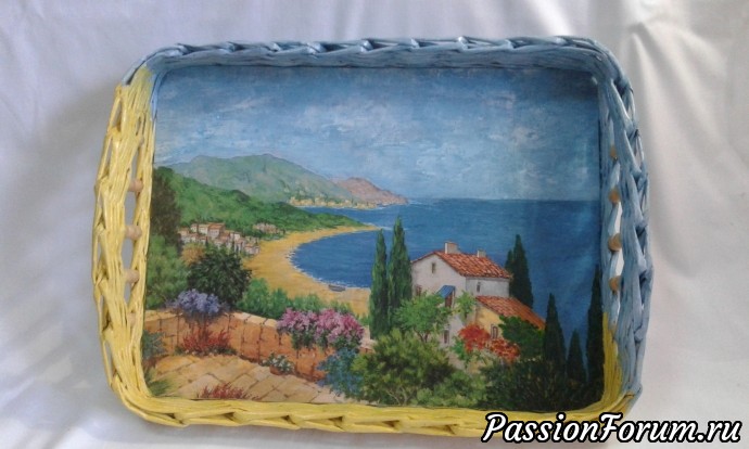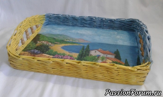поднос выполнен с нуля:выпилила дно,оплела газетными трубочками,декупаж салфеткой плюс значительная подрисовка акриловыми красками.сверху все закреплено акриловым лаком.
