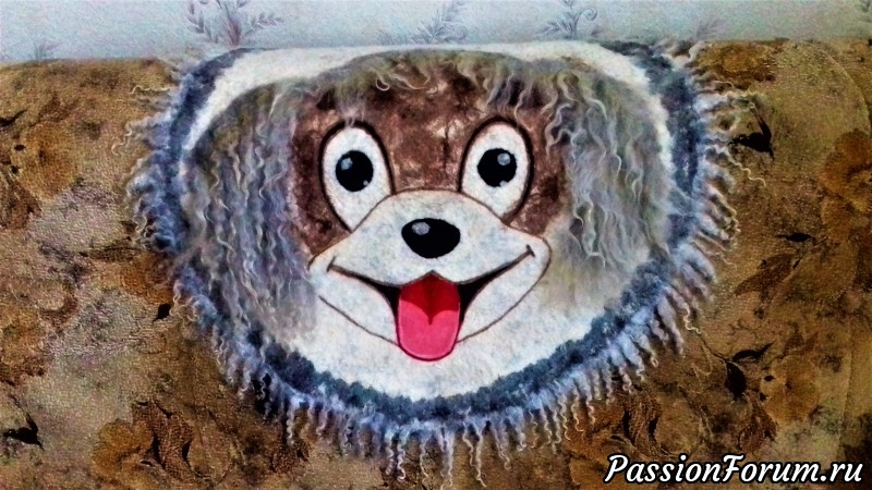 От толстой пряжи для вязания отрываю тонкие пастмочки и прибиваю их иглами, вырисовывая морду, рот, глаза. Этот процесс очень интересный, напоминает проявление фотографий или переводную картинку.