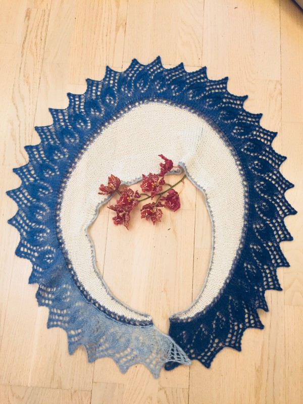 Здравствуйте, девочки.Вот и мой отчёт.Вязала из натуральной шерсти ангорка, после каймы сделала небольшую вставку из 100% секционного акрила.Длинна изделия 130 см, ширина 34 см, вес 84 грамма.Листиков связано 35, спицы№3.Спасибо всем за компанию.