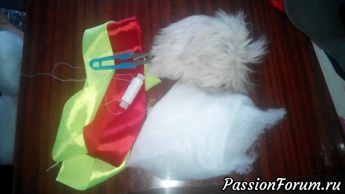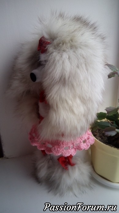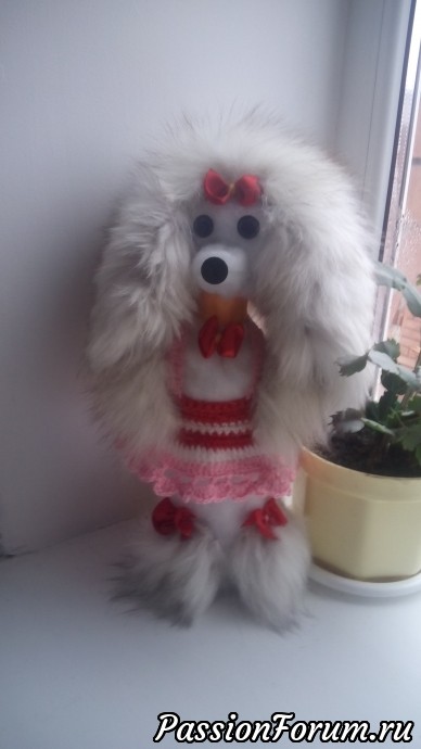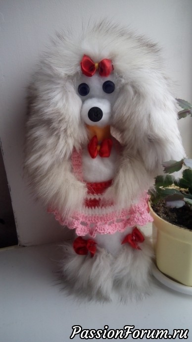А вот ещё одна моя работка, моя Пуделька. Взяла пластиковую бутылку, обвернула белой тканью, а затем синтепоном. Из синтепона сделала голову, перетянула ниткой носик, приклеила глазки и носик(пуговки). Из своих запасов нашла мех, сделала ушки, чубчик, лапки и хвостик. Всё это пришила и приклеила. Связала крючком сарафанчик. Вот и получилось то, что получилось.Высота 40 см. Фоток немного, потому, что на этапе сборки и окончания не было чем фотографировать.