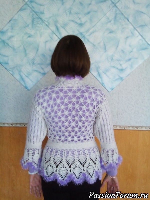 Теперь немного технических деталей вязания: связала сначала пояс столбиками без накида, потом к нему привязывала единым полотном спинку и полочки, потом вниз баску. А в конце уже обвязала каймой горловину и скос полочек. Рукава так же вязала сначала планку, а потом верх отдельно, а низ в конце.