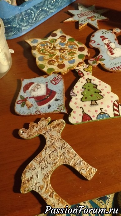 Я поступила просто: наклеила на эту картонку тематическую новогоднюю упаковочную бумагу в звздочки и мотивы с декупажной карты в шарики.