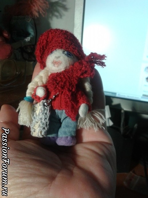 из фетра сама куколка, ну а одежда сшита и связана, сумочка обвязанная соломка.