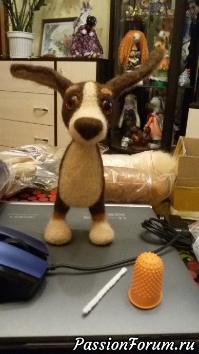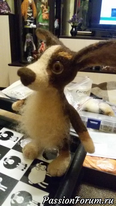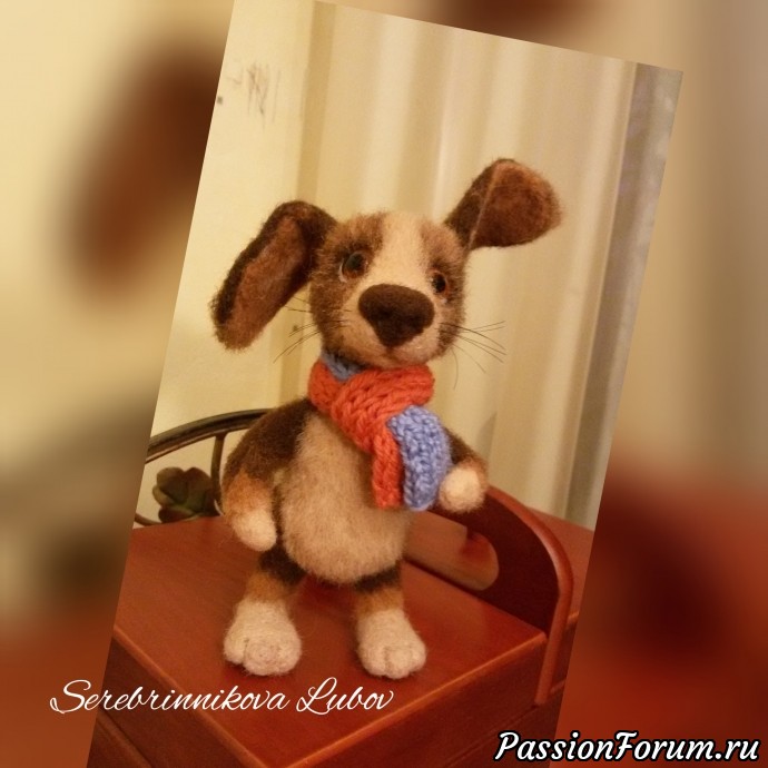 осле котишки-чепушилки захотелось чего-то похожего, но собачьего... Ничтоже сумняшеся приступила к трудам праведным. Собакин в процессе создания был очень похож на пса из м/ф "Жил-был пес". Но после "усушки-утруски" схожесть осталась лишь очень отдаленная... возможно его дальний родственник и многим помоложе... В целом результатом я довольна. Настолько, что моя "жадина" отказалась его продавать. Никому не отдам...