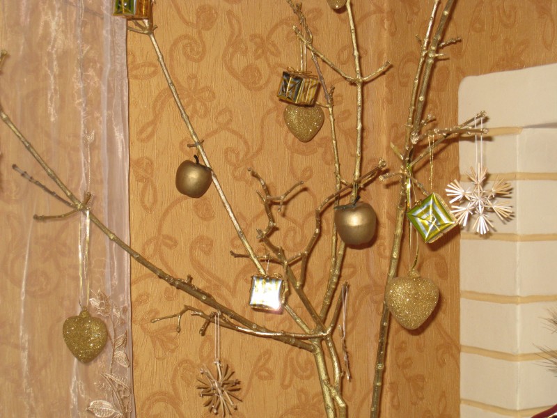 Идея елки из веточек — с этого сайта. Сердечно благодарю рукодельницу, которая поделилась такой роскошной креативной идеей — это именно то, чего не хватало, венок на двери уже начал надоедать, а чем заменить, на тот момент не придумалось, и вот — увидела отличную елку, гармоничную и изящную.