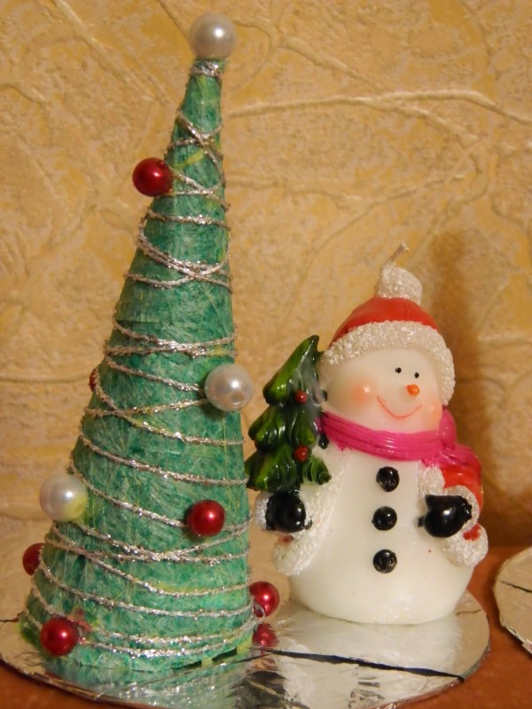 Эта елочка сделана на конусе из шерстяных ниток, а шарики — из бумажных салфеток.