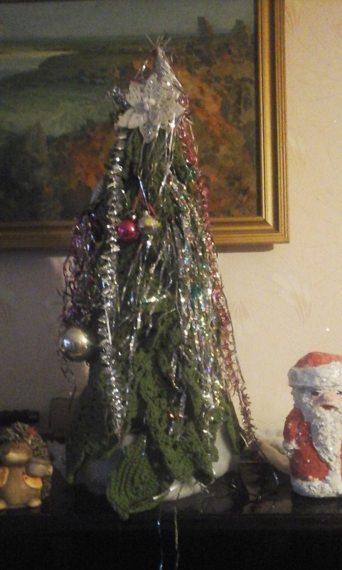 Елочка сделана из вязаных листьев, которые потом превратились в костюм для дочки (далеко не елочный!)
