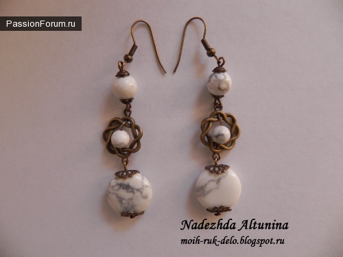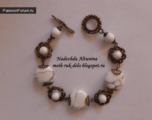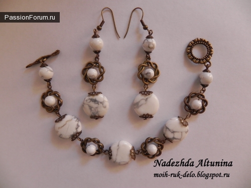 Комплект «Античный храм» выполнен из кахолонга, металлофурнитуры — античная бронза. Браслет 350р., серьги 250р. Народные целители считают, что этот камень лучше всего помогает при женских недугах, а также при беременности. Предполагается, что если женщина носит украшение из кахолонга или просто камень в кармане на животе в последние месяцы беременности, то роды пройдут легко. Молочно-белый кахолонгблагоприятно влияет на центральную нервную систему. Считается, что ношение изделий из этого минерала помогает организму очиститься от шлаков. Камни других оттенков облегчают страдания человека, больного желудочно-кишечными заболеваниями. В Средней Азии считалось, что если некоторое время всматриваться в кахолонг, можно снизить глазное давление.