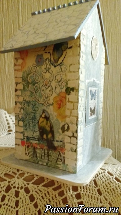 Вот такой домик прилетел мне однажды в посылочке в подарок от одной из наших форумчанок. Лежала заготовка, лежала ровно до начала декабря. Пошла в поисках салфеток с новогодней тематикой. И в салфеточных развалах нашла фот эту замечательную красоту с птичками, бабочками и виньеточками. Дома под нее нашлась бумага для скрапа.