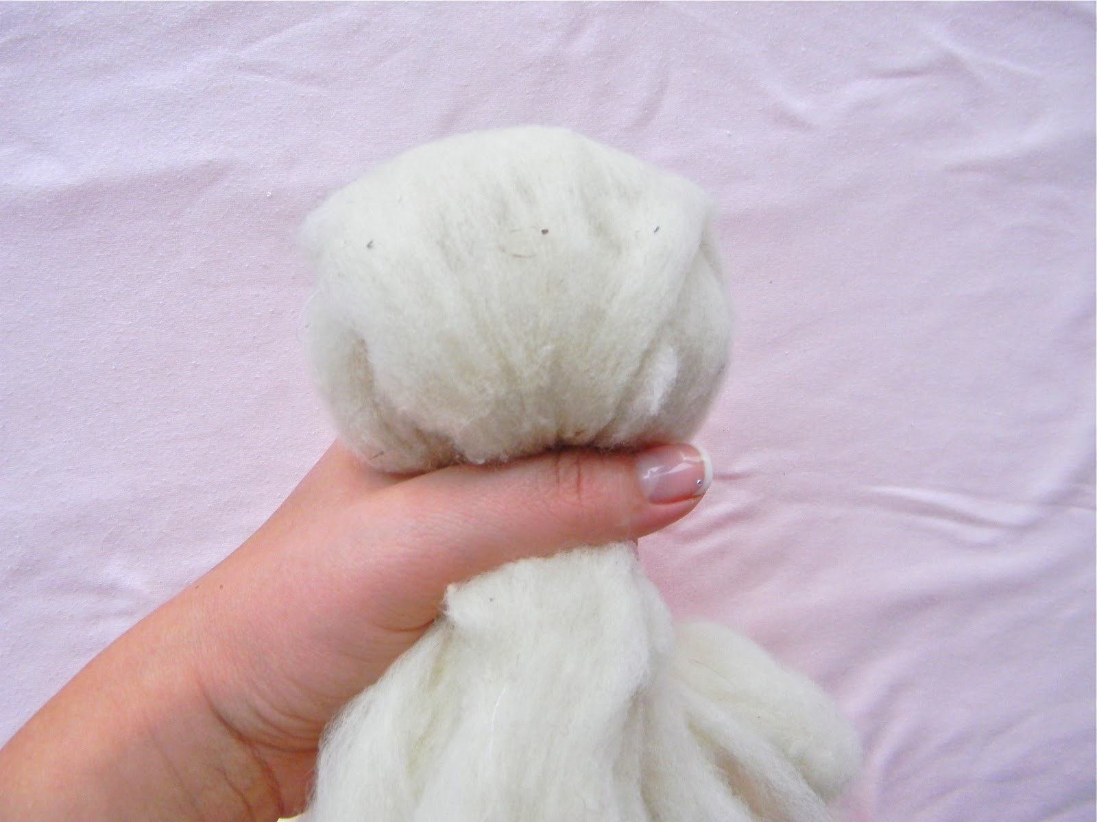 Оборачиваем шерсть или синтепон вокруг клубка и получаем голову. Примеряем нашу голову к телу, если она мала, оборачиваем вокруг головы еще шерсти или синтепона