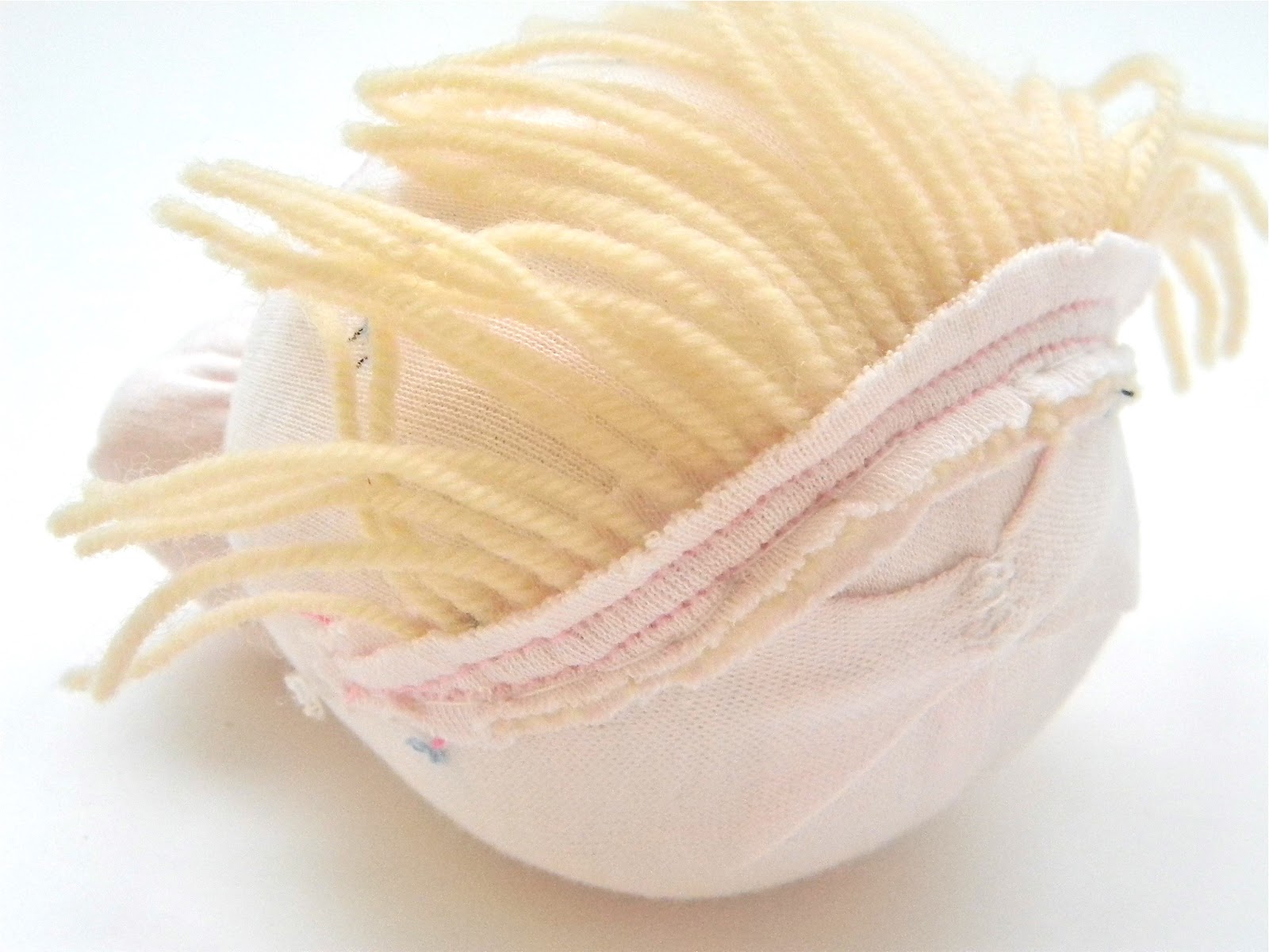 Прикладываем волосы к лицу куклы, отрезаем лишний трикотаж, намечаем, к какому месту головы будем пришивать «паричок» (он должен быть незаметен под колпачком). Волосы пока не подрезаем