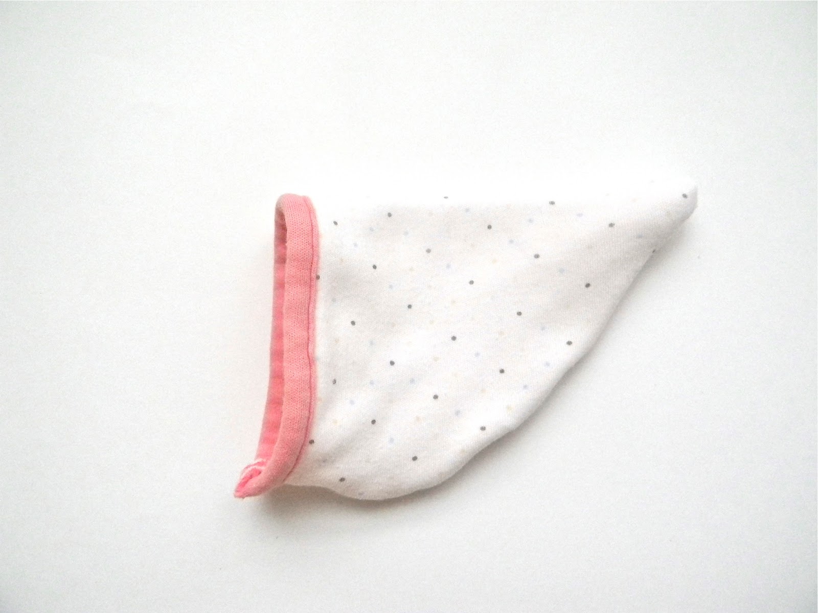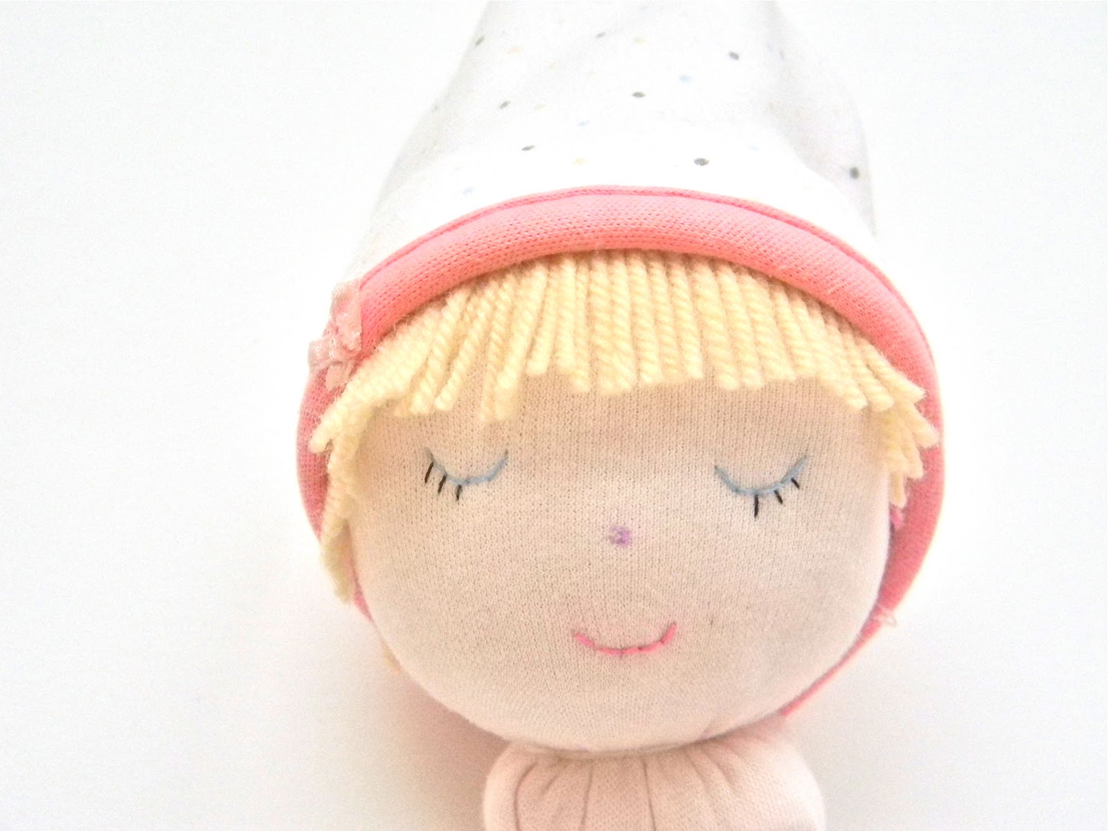 Надеваем на головку колпачок и формируем челочку нужной нам длины. Украшаем при желании колпачок — мы пришили малюсенький бантик. В нескольких местах маленькими стежками фиксируем колпак к голове. У нас на колпаке уже имелся отворотик (он был у пледа, из которого мы шили тело и шапочку), и я делала стежки максимально близко к этому отворотику