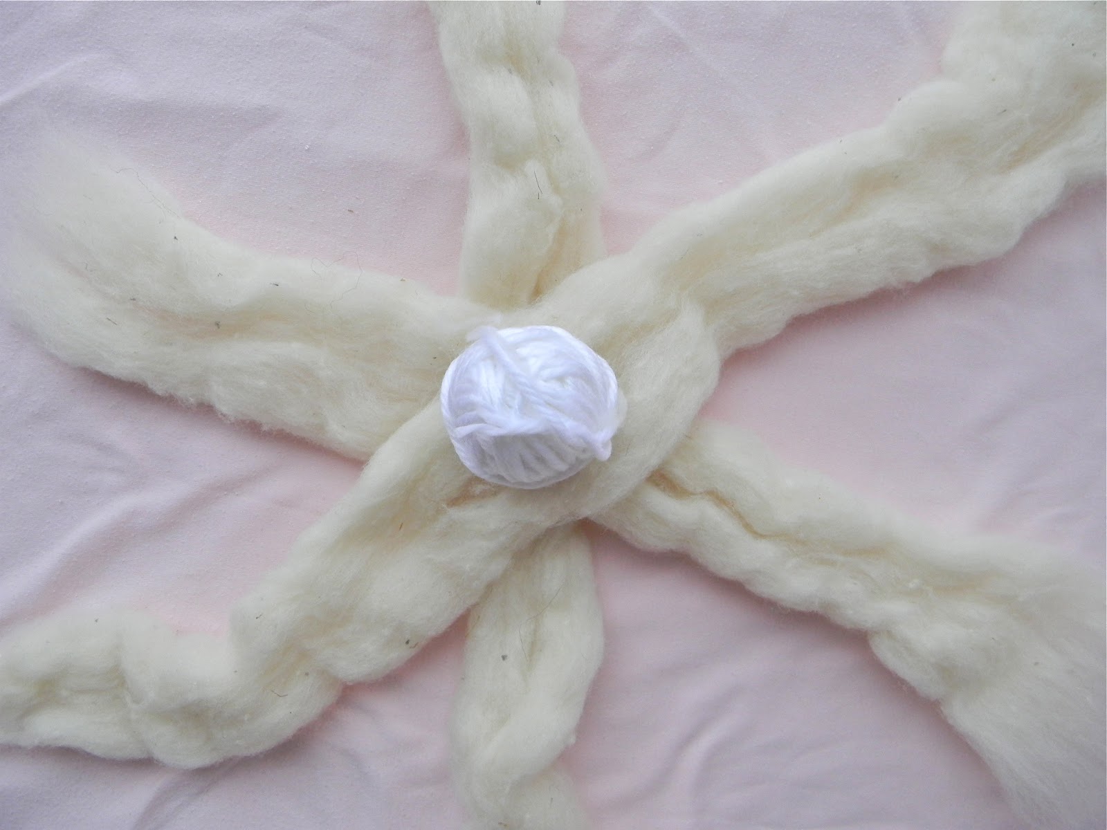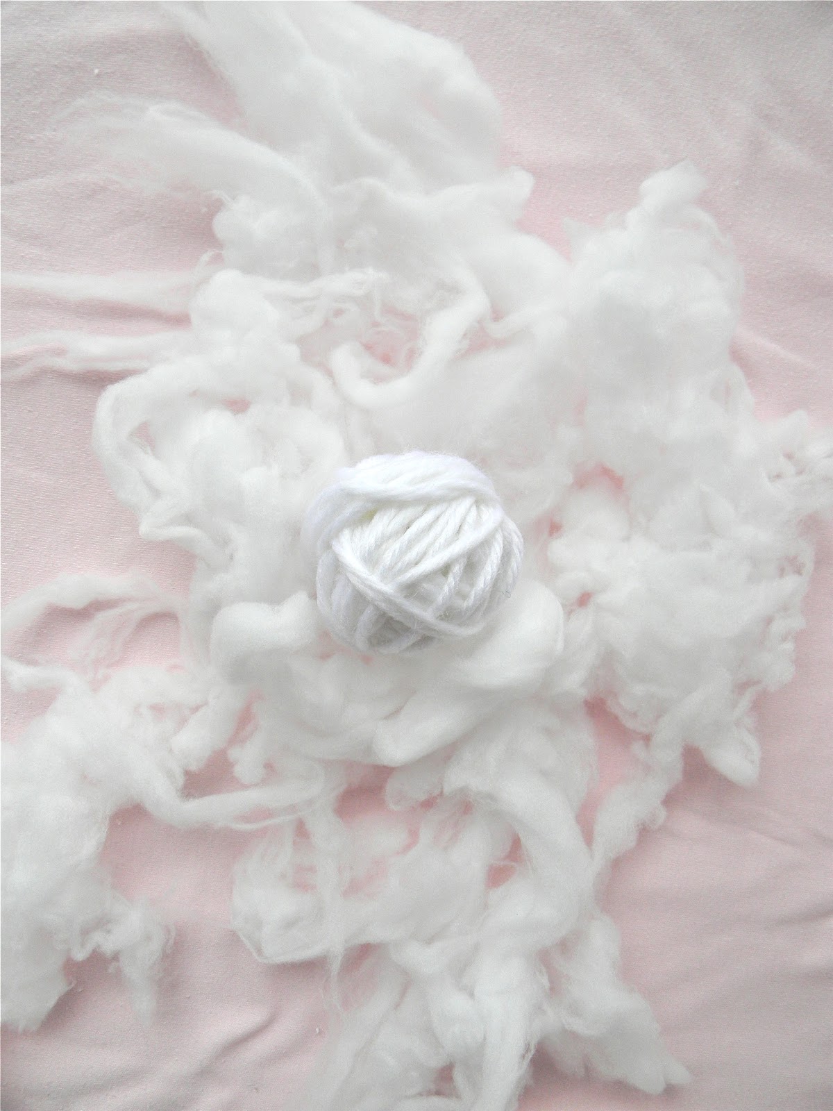 Теперь приступаем к голове. Голова должна составлять 1/3 часть от туловища. Берем клубок ниток (у нас шерстяная пряжа). Если вы шьете для младенца, то можно вместо клубка положить шарик с бубенчиком, тогда это будет еще и погремушка. Для формирования головы нужна шерсть или синтепон. Разницы визуально вы не увидите. Вальдорфская технология подразумевает использование только натуральных материалов, поэтому мы взяли овечью шерсть с Троицкой фабрики, она у нас осталась от шитья трех вальдорфских кукол. Если бы у меня не было шерсти, я бы спокойно использовала синтепон (купила как раз недавно очень качественный немецкий). Если вы взяли шерсть, то раскладываем ее звездой и в центр кладем клубок. Если взяли синтепон, просто раскладываем его, чтобы потом было удобно оборачивать его вокруг клубка