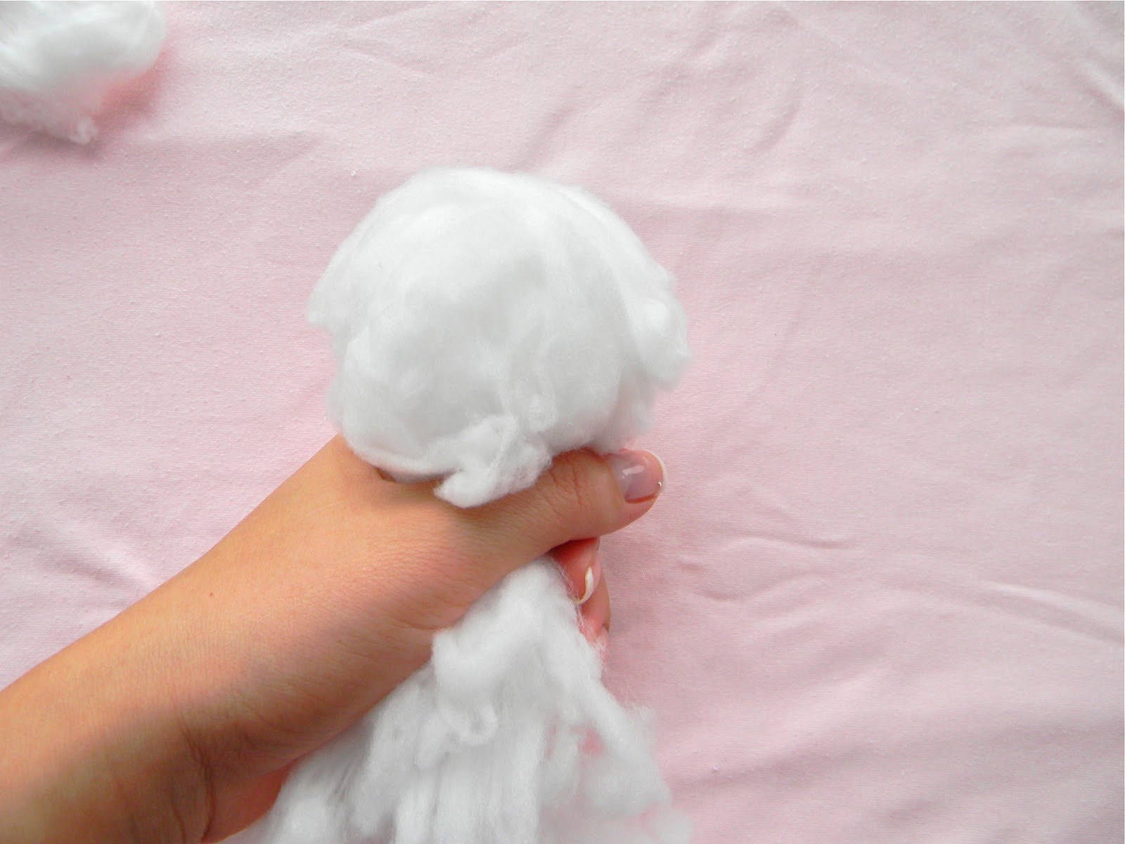 Берем 4 кусочка синтепона или шерсти и набиваем ими концы ручек и ножек, смотрим, чтобы было одинаково и крепко завязываем каждый получившийся бубончик ниткой.