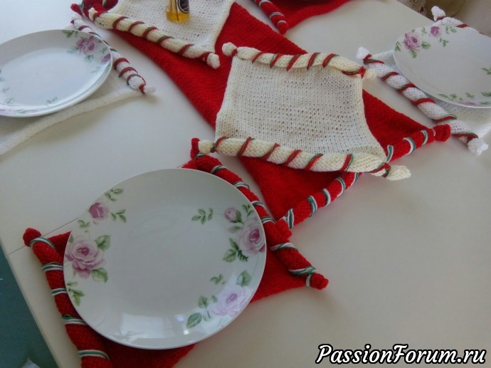 Прямоугольные и квадратные салфетки спицами. Лицевая гладь нужных размеров. Края скручиваются и прошиваются контрастной нитью. У меня получился такой, по истине Рождественский набор. 6 салфеток по две каждого цвета (кремовый, белый, красный), и центральная прямоугольная. Можно комбинировать по вашему желанию и в зависимости от количества гостей. Можно ограничиться двумя цветами. Теплый и уютный, ну и соблюдена цветовая гамма Рождества, конечно же. Вязала в подарок от себя. Надеюсь его обладатели воспользовались им на праздновании Рождества и воспользуются на Новый год.