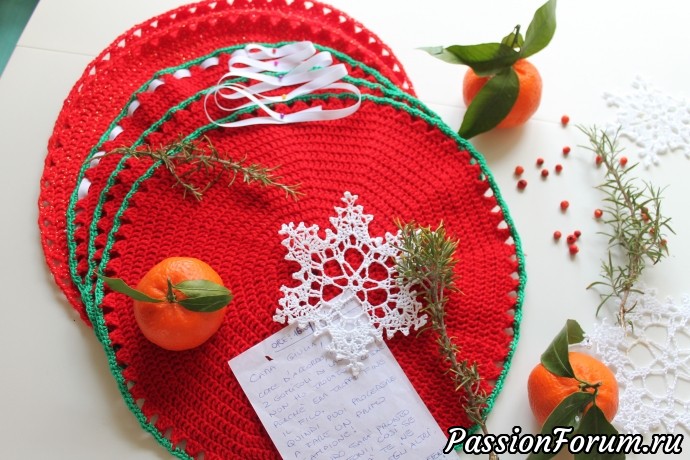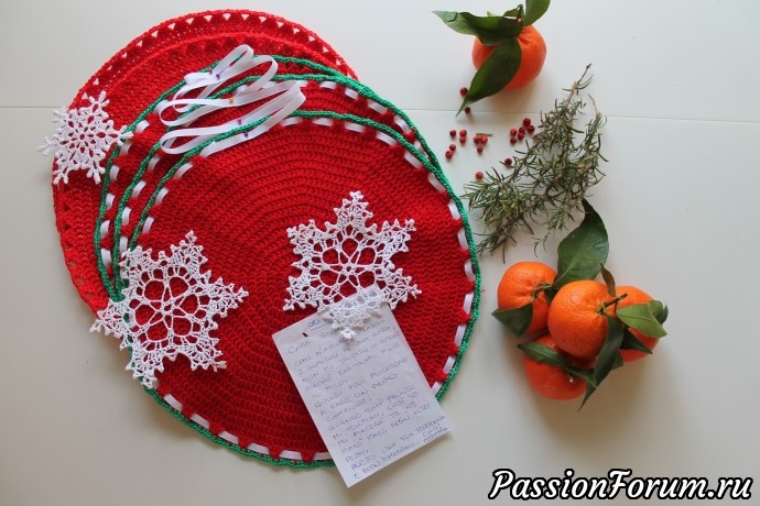 Круглые салфетки крючком. Обычный круг нужного вам размера, ничего нового(у меня 29 см в диаметре). Последний ряд: *три столбика с накидом вместе, три воздушные петли*. Клиентка хотела так и оставить, но я предложила сделать действительно Рождественские салфетки. Обвязала в одни ряд зеленой нитью. (Если салфетка одного цвета, то обвязка не нужна, я ее делала сугубо для добавления цвета) И протянула через столбики последнего ряда белую ленту. Такой получился Рождественский набор из 10 салфеток под тарелки.