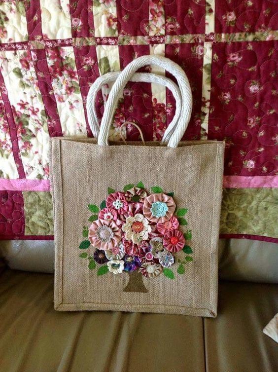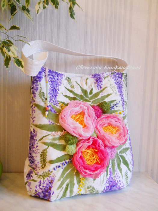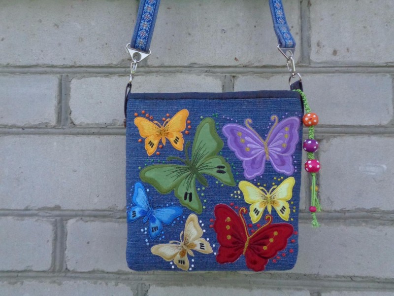 не умеете делать цветов или расписывать красками? Вот на сумке уже готовые бабочки на клеевой основе, в любом магазине тканей есть