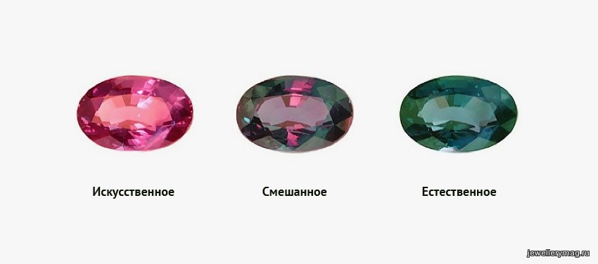 Александрит является разновидностью хризоберилла. При искусственном освещении природный александрит красно-фиолетоый, при дневном становится темно-зеленым.