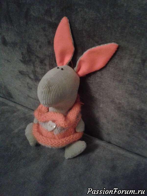 Ошибок и огрехов много, но задача была дойти до конца, т.е. сшить игрушку, поэтому довольна. Не надо было брать вельвет, его трудно выворачивать, игрушка маленькая, а опыта нет, но справилась все же.