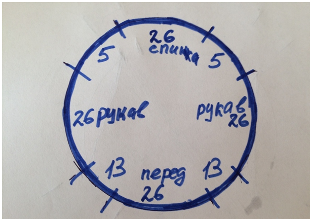 Прибавки делала только в тех частях которые между передом рукавами и спинкой.