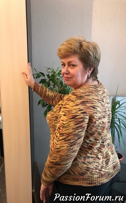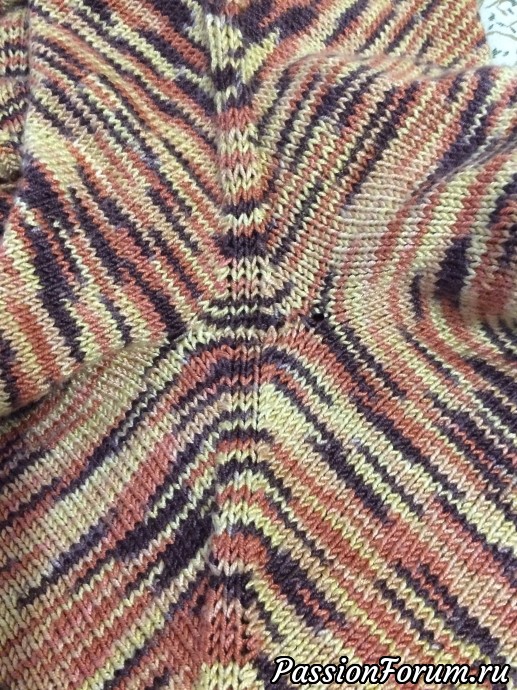 Но мне не хотелось вязать просто реглан сверху… Да ведь и полосу спереди я сделала достаточно широкой…