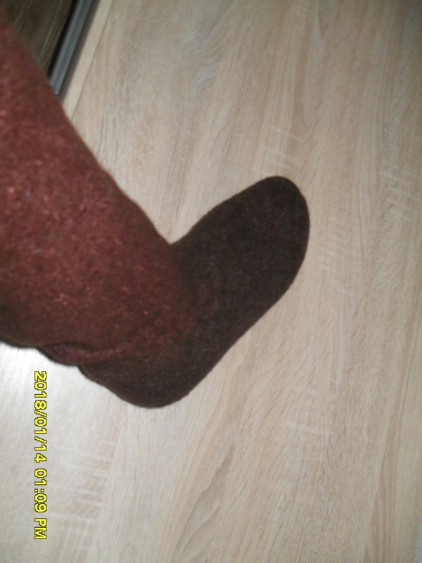 Начаты были с месяц назад, две недели делала перерыв — для отдыха рукам, сильно болели. Полуфабрикат был высушен, оставалось подогнать по ноге. И тут оказалось, что засунуть внутрь ботфорта колодку никак не возможно — она у меня литая, встает в щиколотке дубом, и не протолкнуть… К тому же гложут мысли - это не тапок, затолкнуть я может и затолкну неимоверными усилиями, а как потом вытащить??? — как бы не пришлось производить вскрытие)))) При этом нога входит нормально, сам ботинок вокруг ступни не болтается, войлок стучит уже, очень твердый и плотный… Читала, что девочки подгоняют прямо на ноге. А как? Какие действия это подразумевает? Срочно нужен совет!