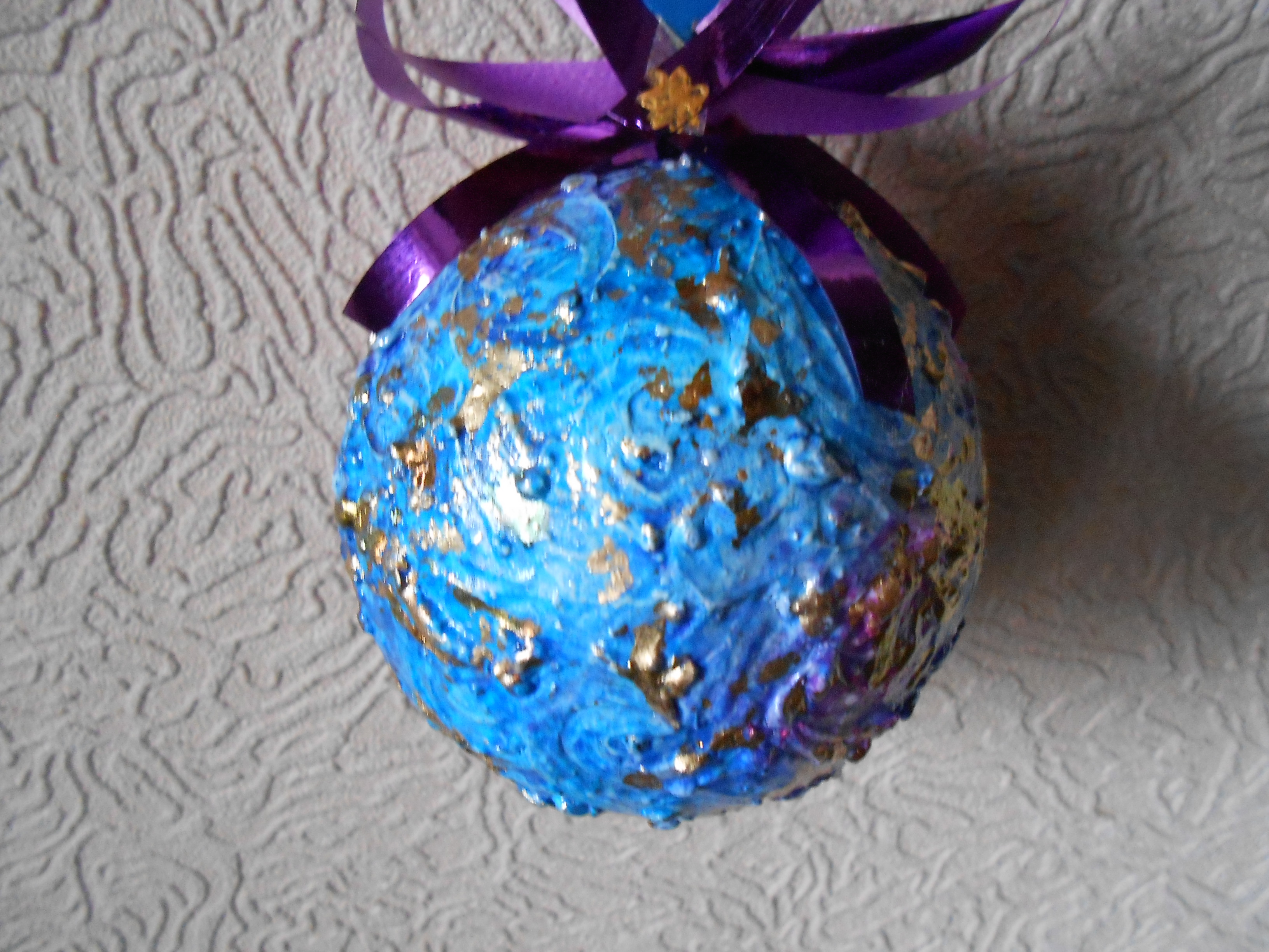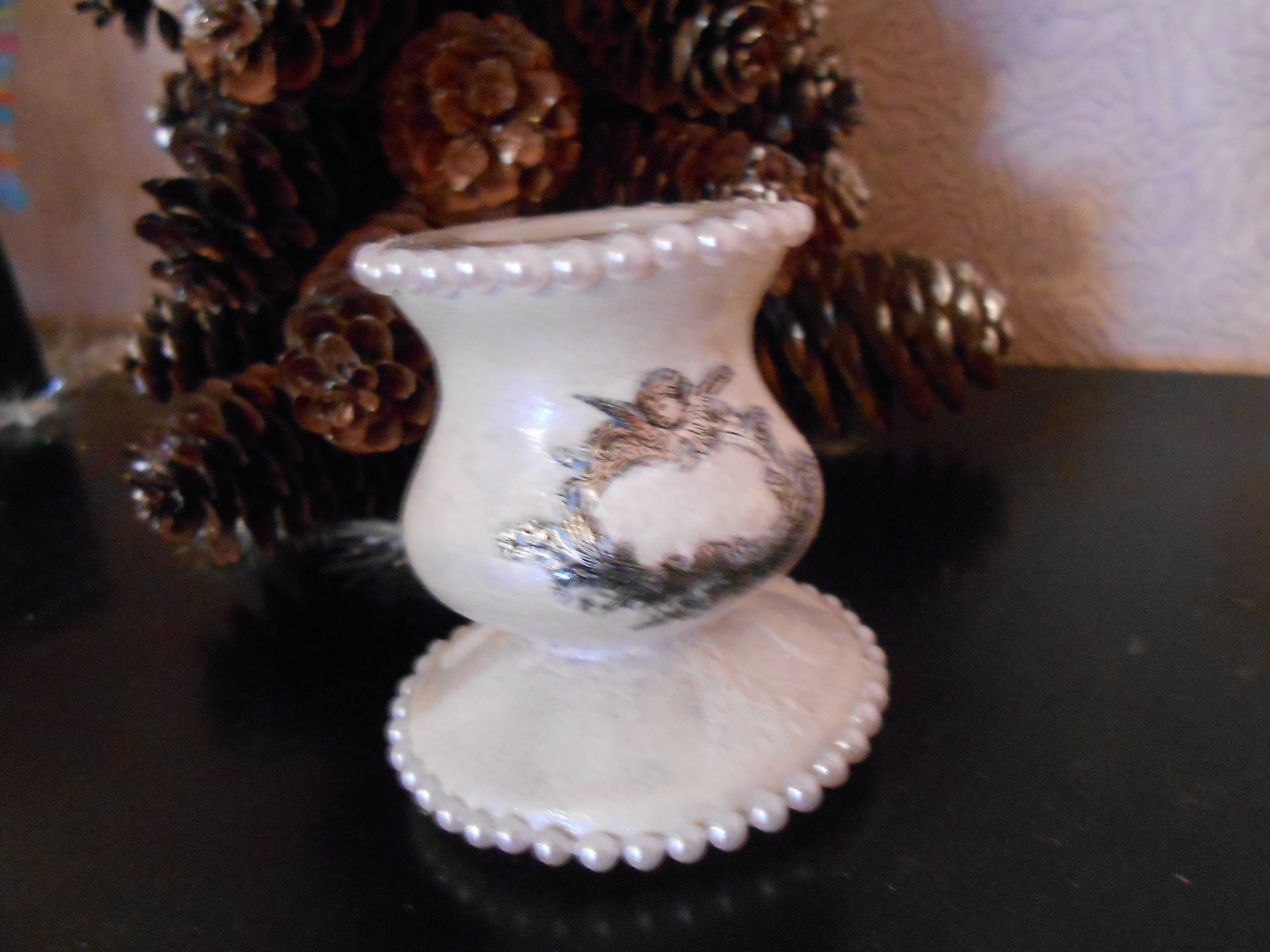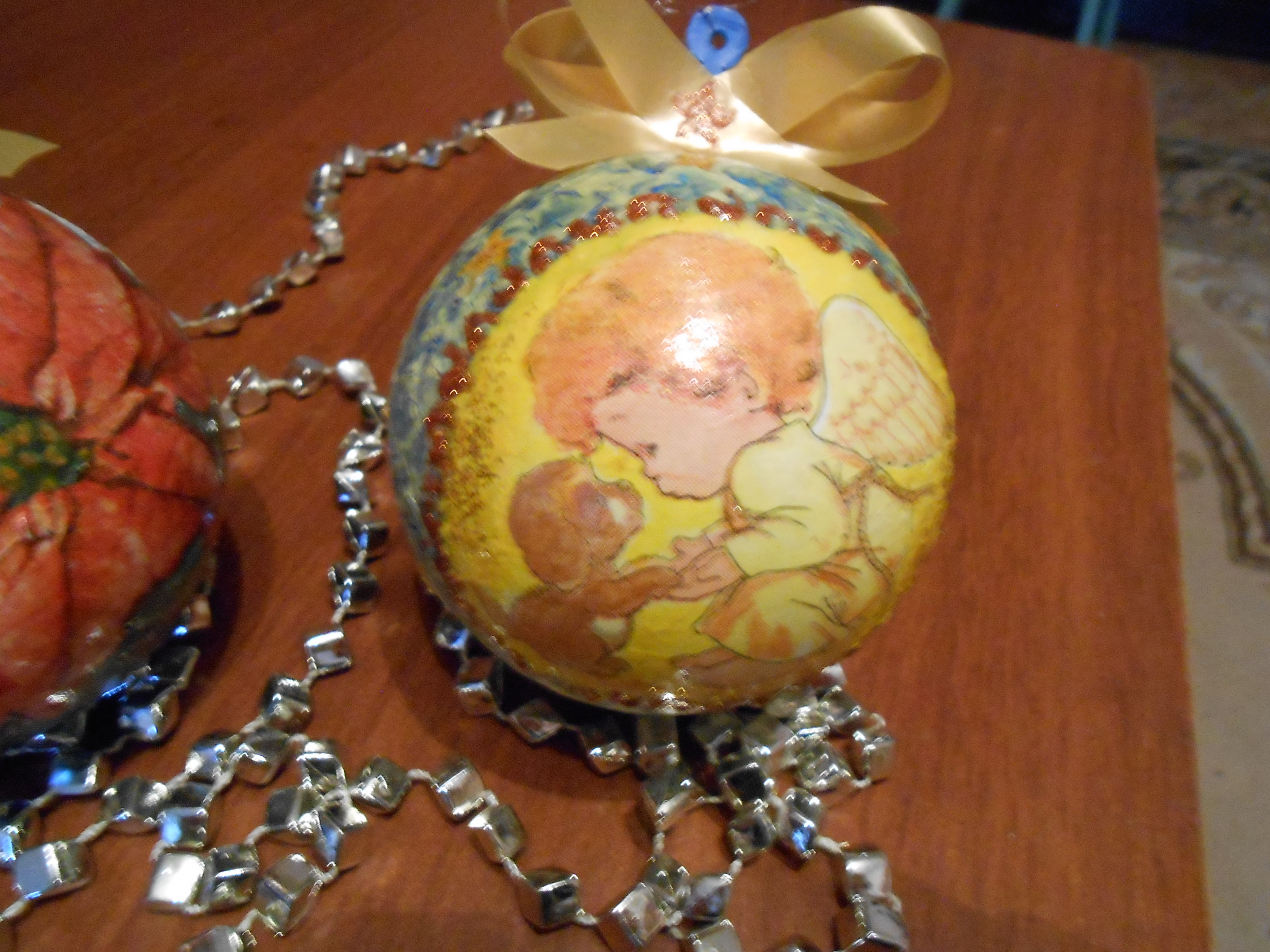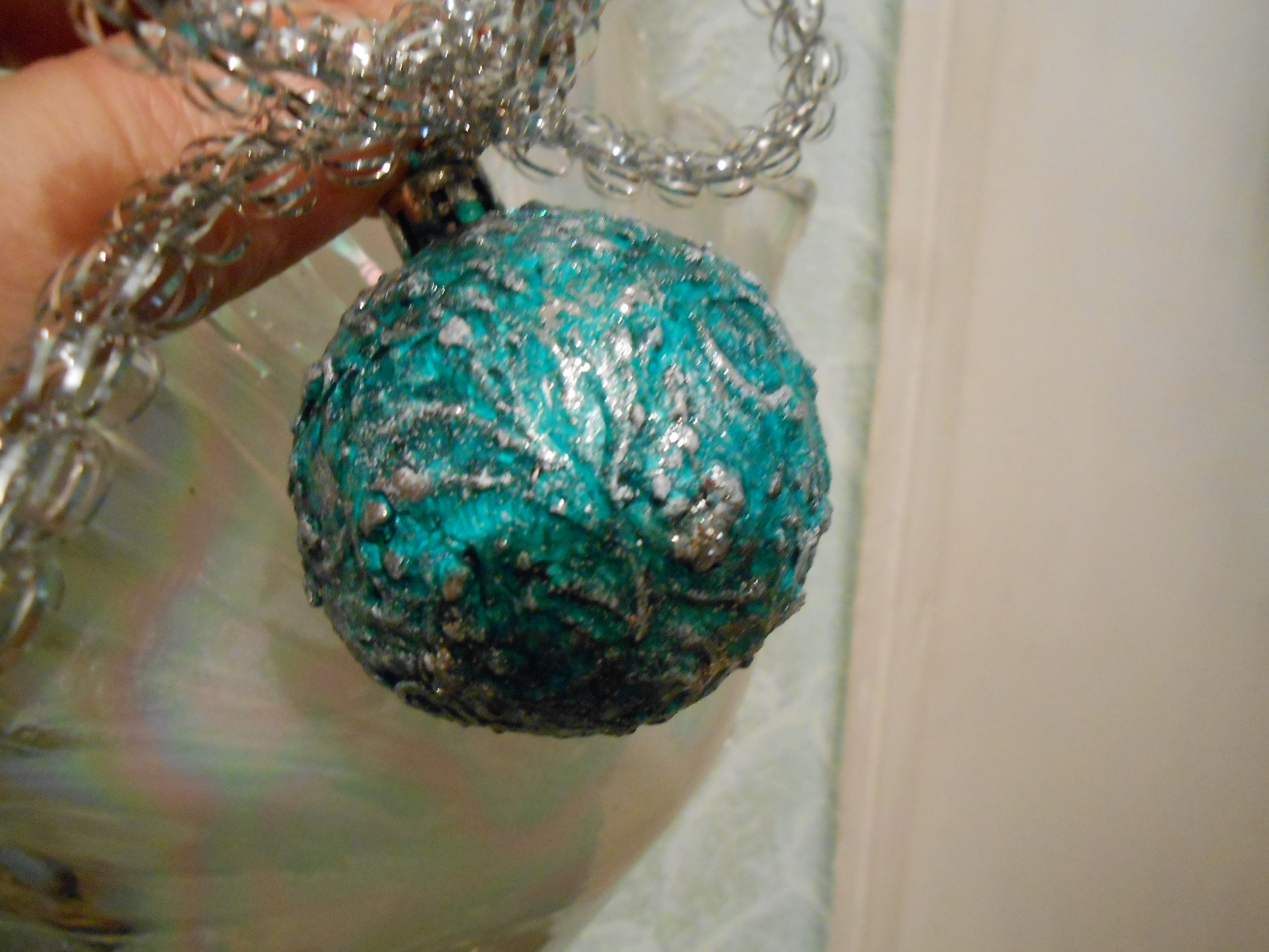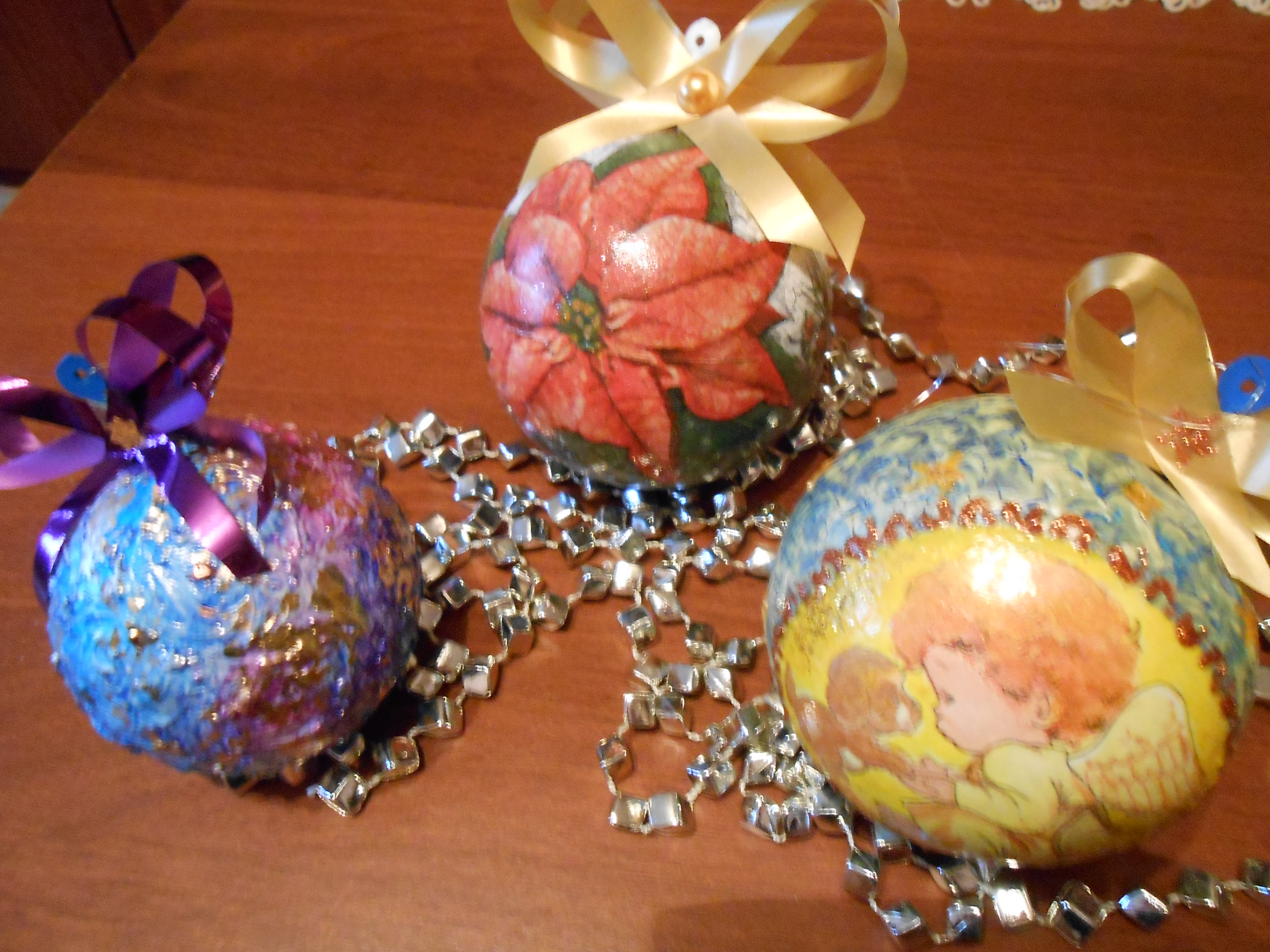Использовала декупаж,интерферирующую акриловую краску,искусственный снег,полубусины,лак.