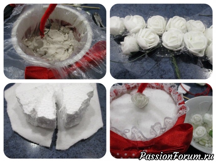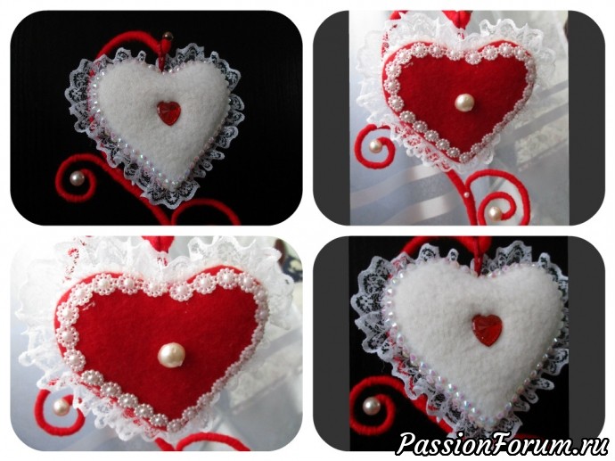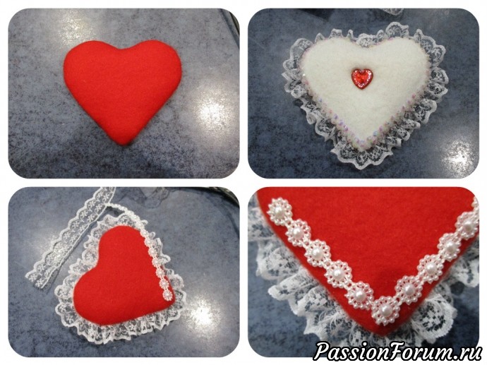 Почему 2 сердца в одном дальше будет понятно. Для этого мне нужны материалы : ткань флис белая и красная,кружево,разные бусины и стразы,сеточка,нитка красная шерстяная,лента атласная красная и в горошек,розы маленькие из фома,клей пистолет,алебастр,пакетик,проволока,картон,уплотнитель для объёма.