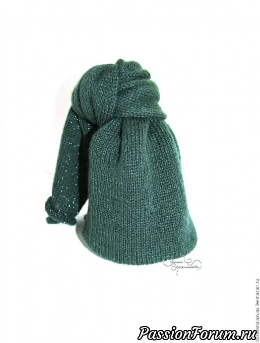 Это шапочка из комплекта Хлоя на Ярмарке. Я могу предположить, что шапочка связана чулочной вязкой, (я бы вязала по кругу, тогда только одними лицевыми петлями, что увеличивает скорость вязания) низ двойной, чтобы не растягивался там протянута нитка-резинка. Связав высоту шапки (двойную), я бы отметила это место и вязала полотно для узла, затем «хвост» — здесь можно добавить или бисер или блестящую нить как у автора. Необычность шапке придает простой узел. Помните только, что в описании указана мягкая и тонкая шерсть, от выбора материала зависит многое. Удачи!